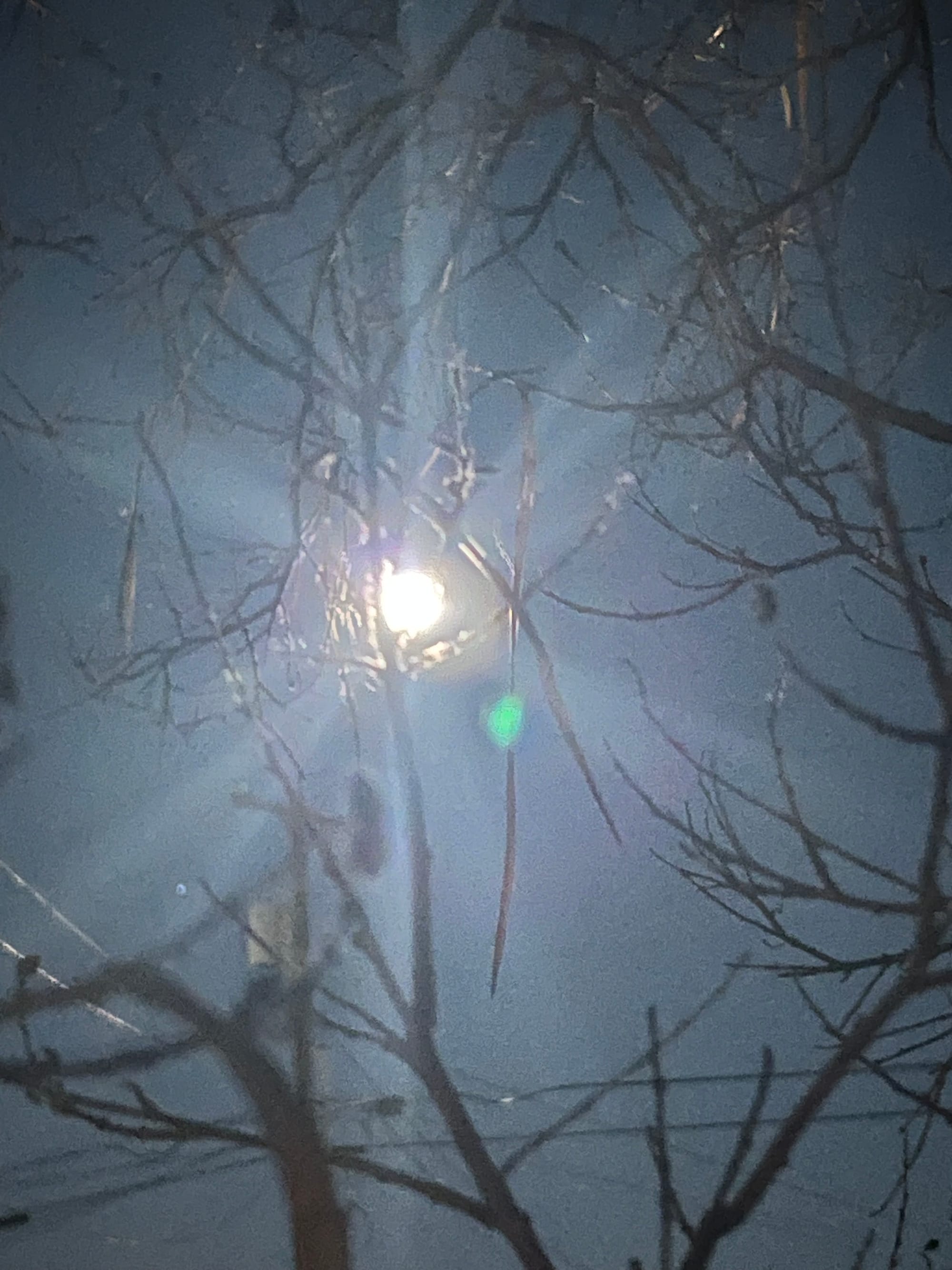 Yes, the cold moon is here. I saw it sitting on Mountain View Road just as the 5pm sit started. After, I went out and looked where she had been and there was just a little, barely glowing silvery thing. What happened? Oh, up to the north, there she is. What's that, then? The back of the stop sign on the corner.